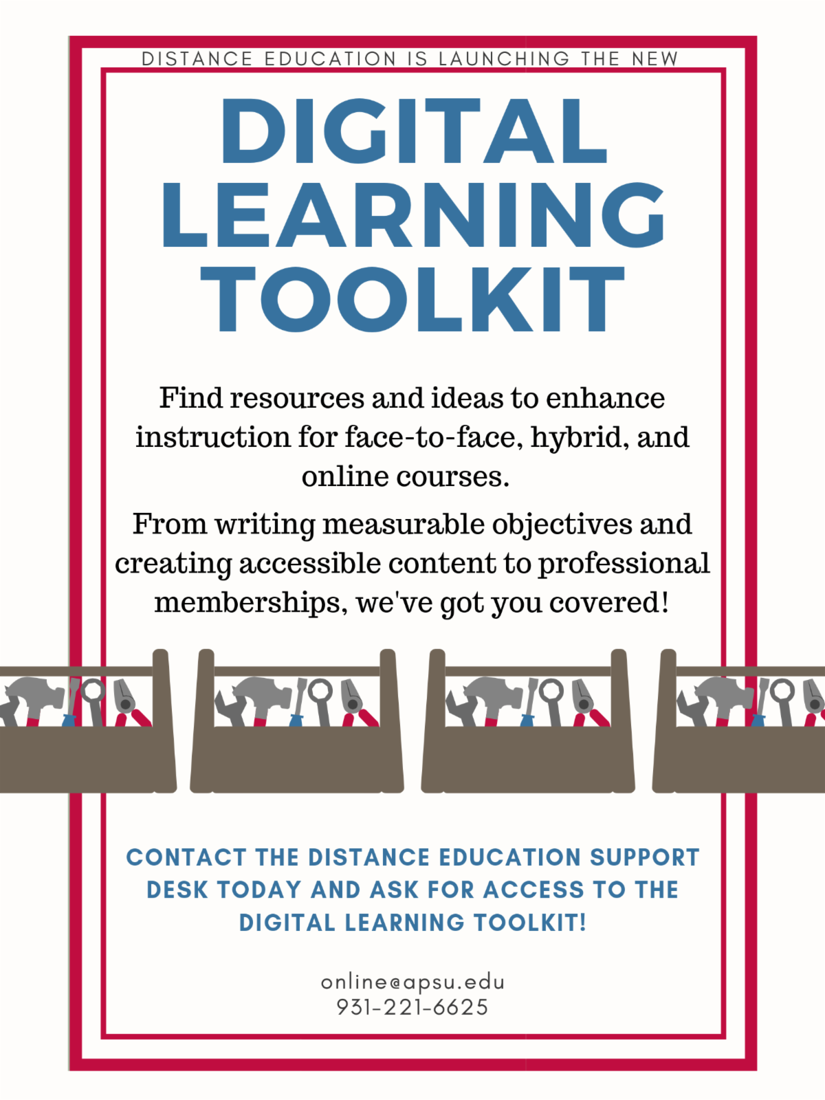 The Department of Distance Education (DE) is committed to the quality of online and hybrid courses offered at Austin Peay State University (APSU) and aims to achieve the following targets: