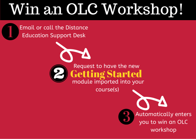 Have you heard about our GETTING STARTED module? Our team of instructional designers have revamped the Getting Started module in D2L and made it better than ever. This module is filled with resources and materials to get you and your students off on the right foot with your D2L course. Contact the Distance Education Support Desk to have this module copied into your live course and be entered into a drawing for an OLC Workshop. Contact the