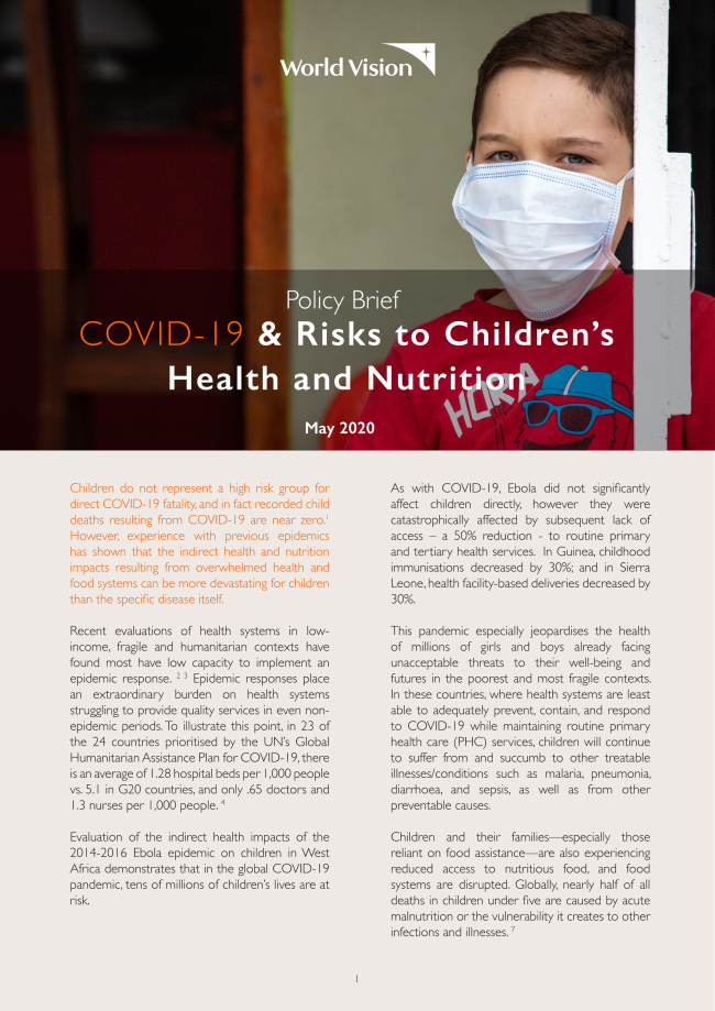 Based on experience working with children, families and communities in emergencies, including epidemics, in this policy brief, World Vision outlines a number of recommendations for Governments, UN Agencies, Donors, NGOS, Private Sector and Faith Leaders to mitigate the impacts of COVID-19 on children’s health and nutrition, particularly for vulnerable children.