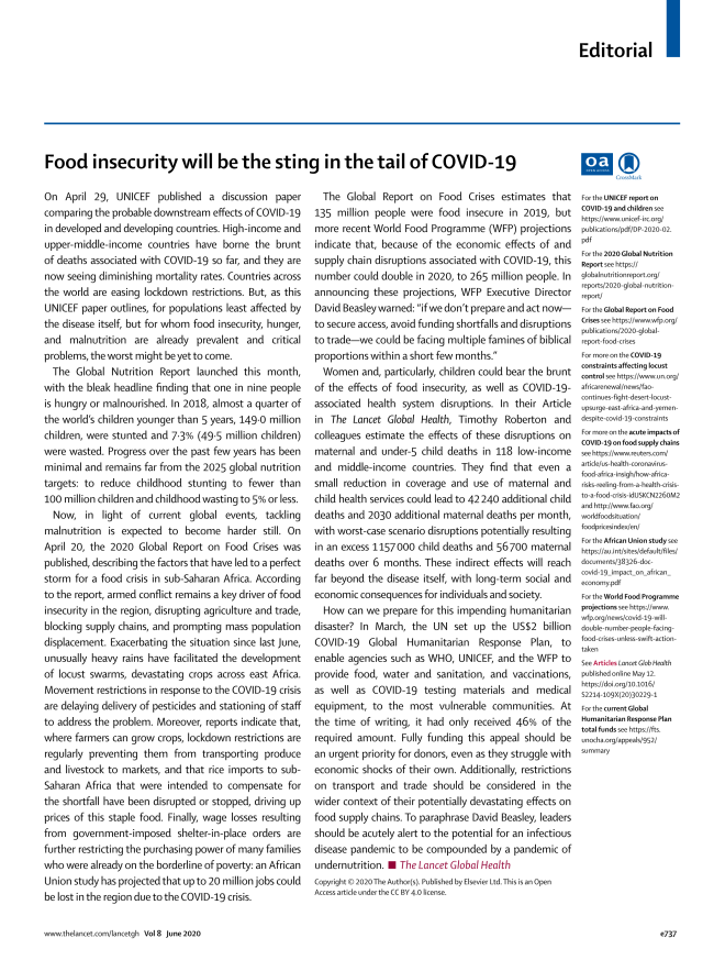 This editorial from The Lancet Global Health discusses the effect of COVID-19 on food insecurity, particularly for women and children.