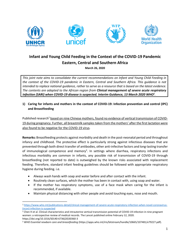 This joint note from UNHCR, UNICEF, WFP, and WHO aims to consolidate the current recommendations on Infant and Young Child Feeding in the context of the COVID-19 pandemic in Eastern, Central and Southern Africa.