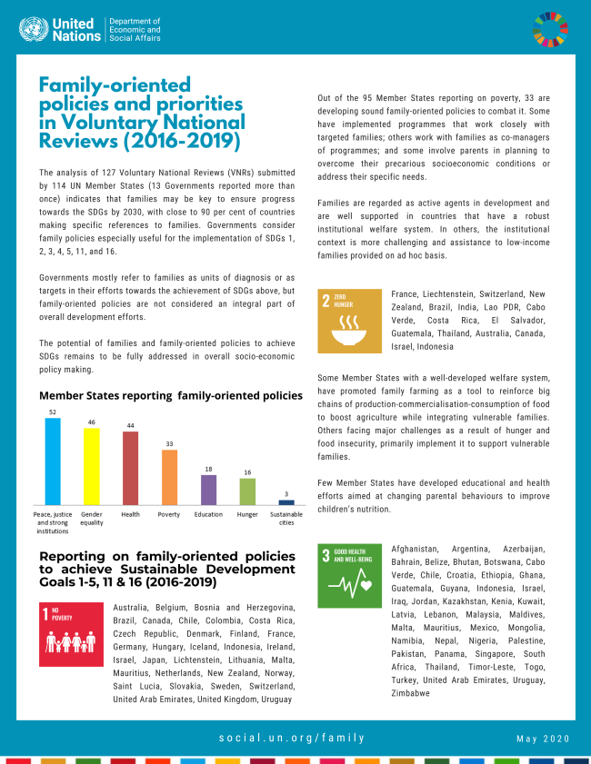 This briefing paper from the United Nations Department of Economic and Social Affairs of 127 Voluntary National Reviews (VNRs) submitted by 114 UN Member States (13 Governments reported more than once) indicates that families may be key to ensure progress towards the SDGs by 2030, with close to 90 per cent of countries making specific references to families.
