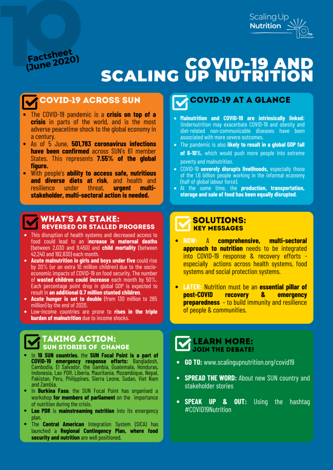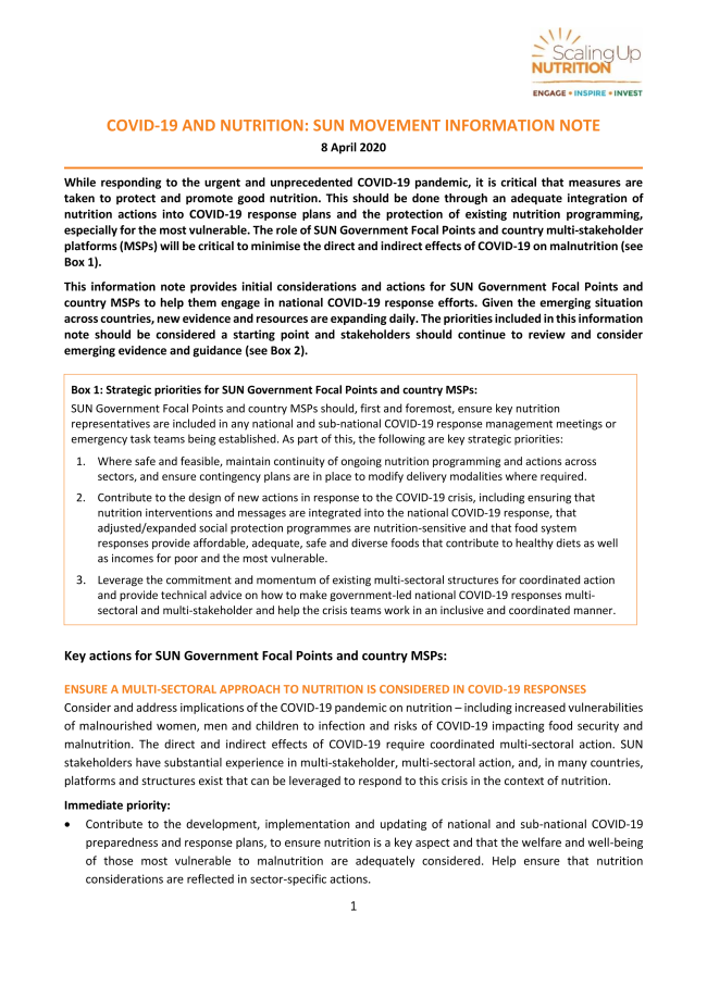 This information note provides initial considerations and actions for Scaling Up Nutrition (SUN) Government Focal Points and country multi-stakeholder platforms (MSPs) to help them engage in national COVID-19 response efforts to protect and promote good nutrition. This should be done through an adequate integration of nutrition actions into COVID-19 response plans and the protection of existing nutrition programming, especially for the most vulnerable (including vulnerable children).