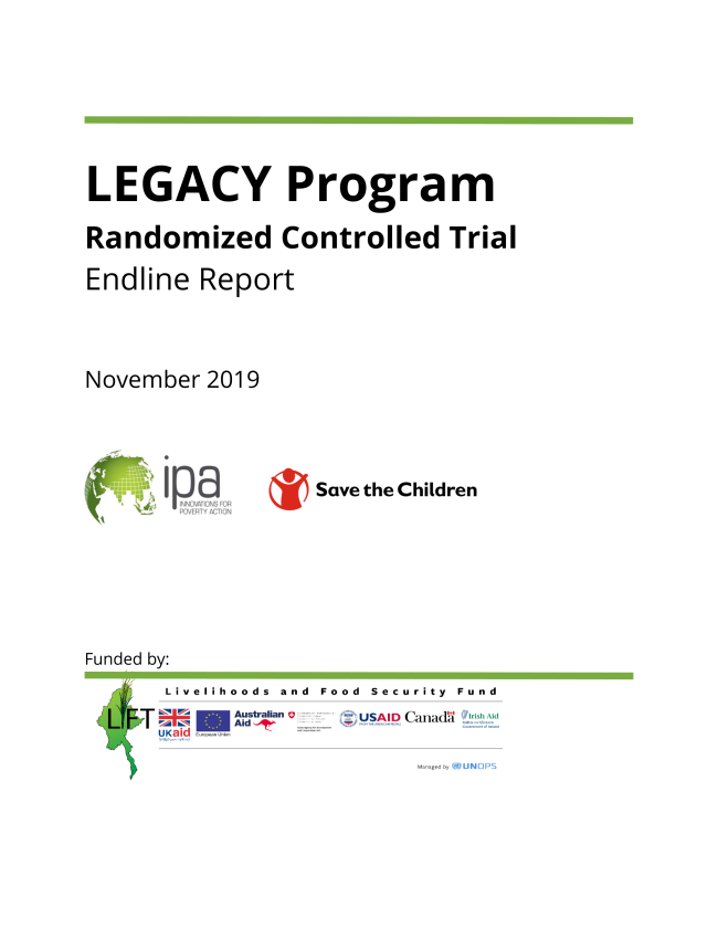 This experimental evaluation measures the impact of the LEGACY program on child nutrition. The program, implemented in three townships across Myanmar’s central dry zone, provided monthly cash transfer to mothers in their last two trimesters of pregnancy until the child turns two years old, as well as a monthly Social and Behavioral Change Communication (SBCC) activity supplementing the cash transfers, covering a range of topics related to nutrition and child health. The evaluation explores potential effects on other outcomes, such as debt, savings, women’s decision making, desired fertility and family planning, usage of cash transfers, and exposure to SBCC.