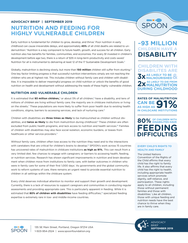 This advocacy brief from SPOON notes that successful nutrition interventions are not reaching the children who are at highest risk, including children without family care and children with disabilities, and outlines four key actions that can help to ensure that children without family care and children with disabilities have opportunities to grow and thrive.