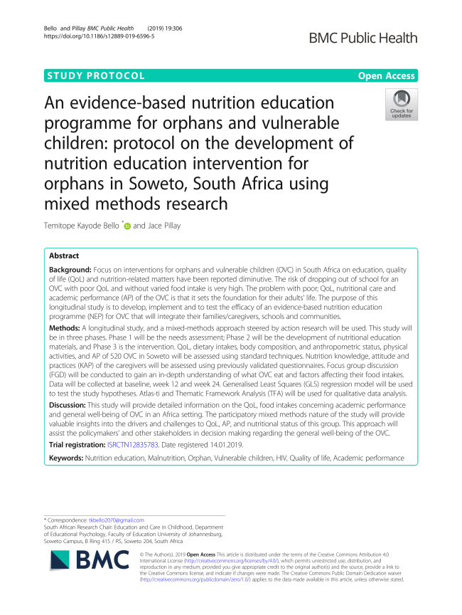The purpose of this longitudinal study from BMC Public Health is to develop, implement and to test the efficacy of an evidence-based nutrition education programme (NEP) for orphans and vulnerable children (OVC) in South Africa that will integrate their families/caregivers, schools and communities.
