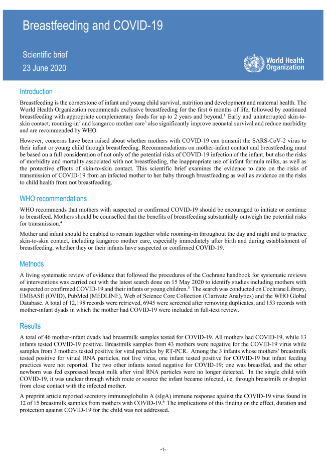 This scientific brief from the World Health Organization (WHO) examines the evidence to date on the risks of transmission of COVID-19 from an infected mother to her baby through breastfeeding as well as evidence on the risks to child health from not breastfeeding.