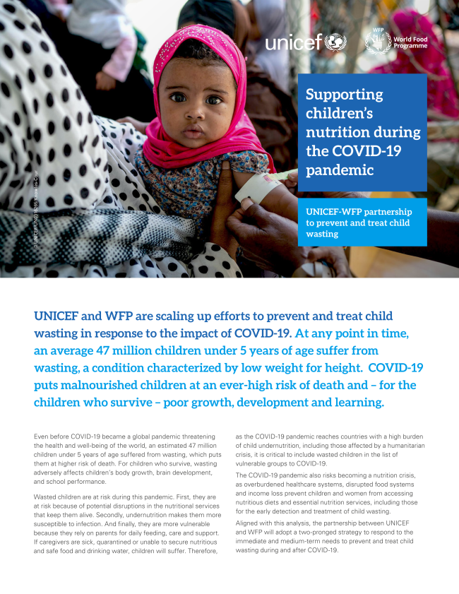 This two-page brief outlines the UNICEF-WFP partnership's two-pronged strategy to respond to the immediate and medium-term needs to prevent and treat child wasting during and after COVID-19.