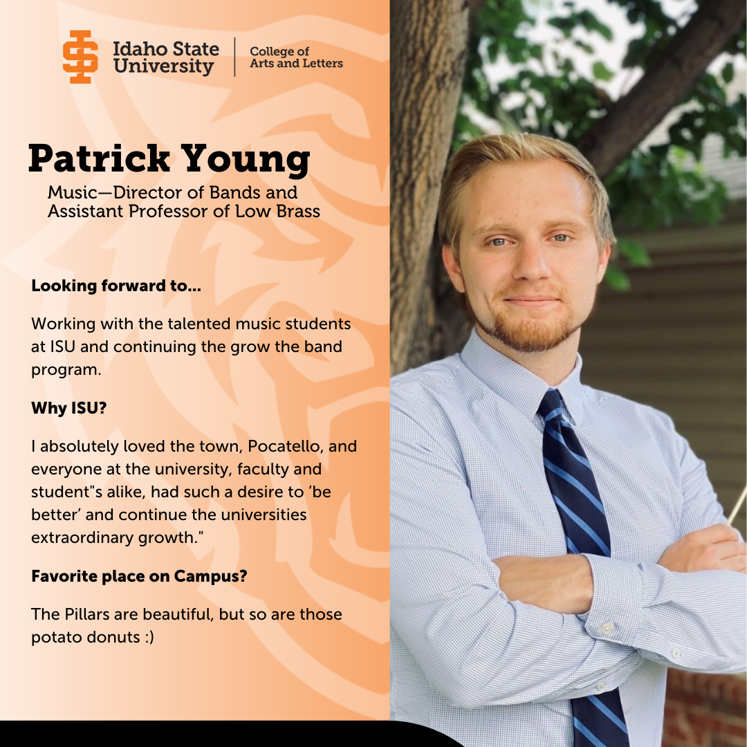 My name is Patrick Young and I am thrilled to be joining the faculty at ISU! I’m from the North Georgia area and enjoy hiking and spending a lot of time with my Siberian Husky, Kirby. My primary performing instrument is the tuba, but I play the trombone, euphonium, piano, and I sing. In addition to my duties at ISU, I will also be performing with the Colorado Opera in Denver, Colorado. I am thrilled to be back out west and very much look forward to working with all of the students. JOIN the bands at ISU!!! :) Any student interested in joining the band program at ISU, including the marching band, please contact me! I’m excited to get to work!