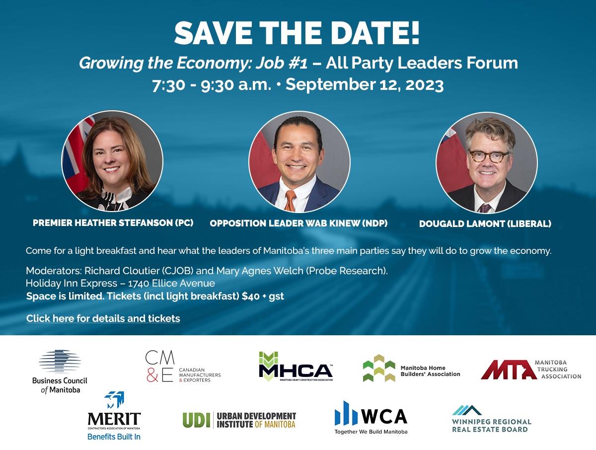 Premier Heather Stefanson (PC), Opposition Leader Wab Kinew (NDP) and Liberal Leader Dougald Lamont will meet moderators Richard Cloutier (CJOB) and Mary Agnes Welch (Probe Research) in a rapid Q&A forum, to discuss their priorities and how each will set out to ensure Manitoba’s economy grows.