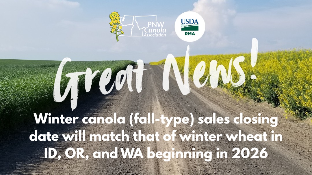 It's been a long road, but after working closely with the U.S. Department of Agriculture-RMA office in Spokane, receiving input from winter canola growers and insurance agents, and submitting letters to the regional and national RMA offices, we are pleased to share this news! The sales closing date will be moved from August 31 to September 30, effective with the 2026 crop year.