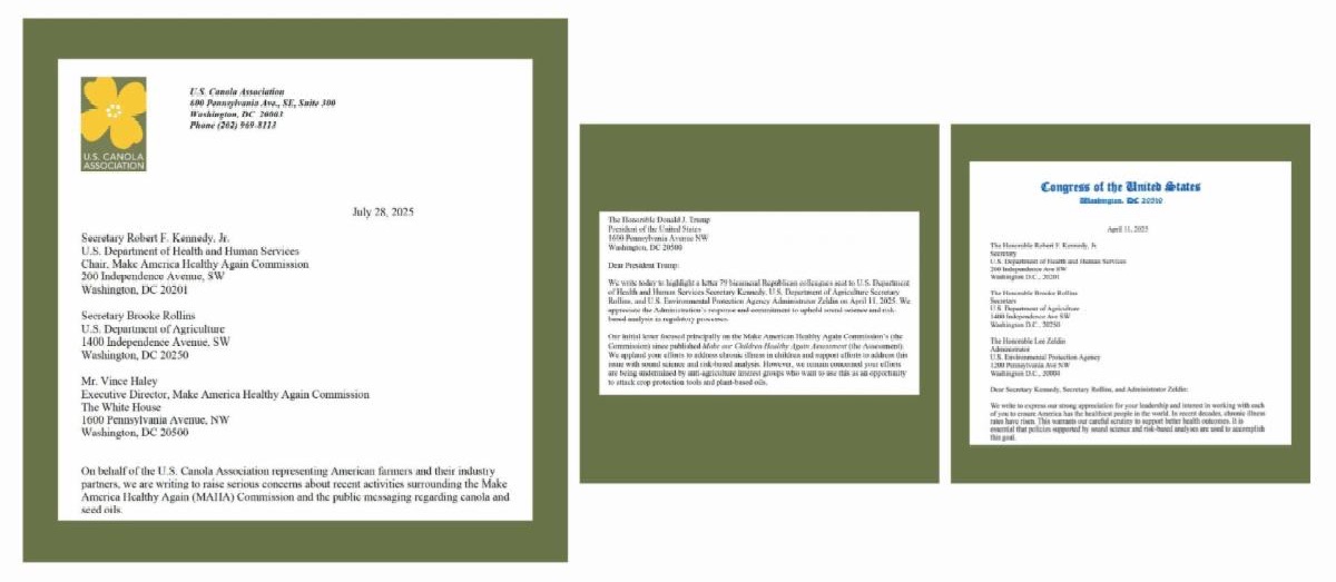 On July 28, the U.S. Canola Association (USCA) sent a letter to HHS Secretary Kennedy, USDA Secretary Rollins and the Make America Healthy Again (MAHA) Commission urging them to stop their messaging that suggests canola oil is unhealthy and ensure the MAHA Commission's actions and messages are rooted in credible science and risk-based analysis.