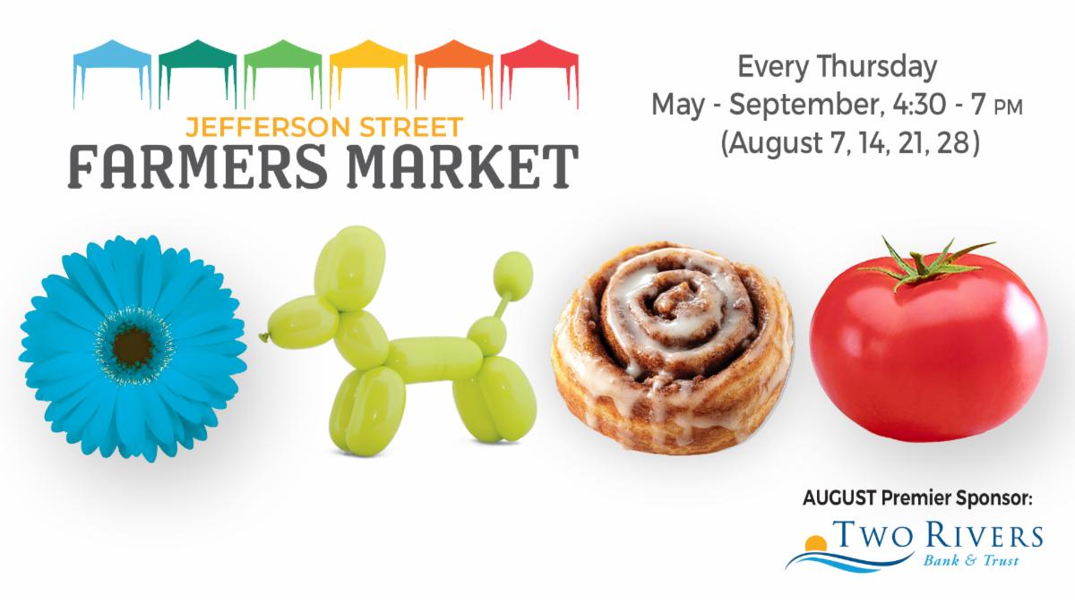 The Jefferson Street Farmers Market takes place every Thursday from 4:30 to 7:00 PM on Jefferson Street between 3rd and 6th Streets. With the street closed to vehicle traffic, it’s the perfect place to wander, shop, dine, and connect with the community.