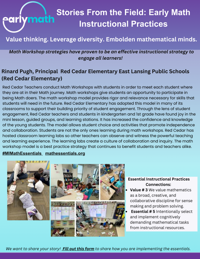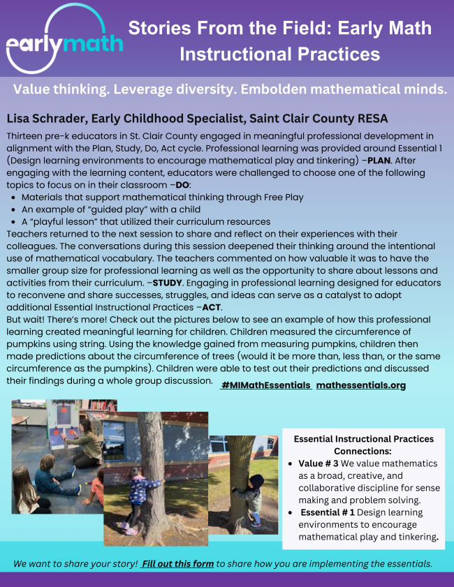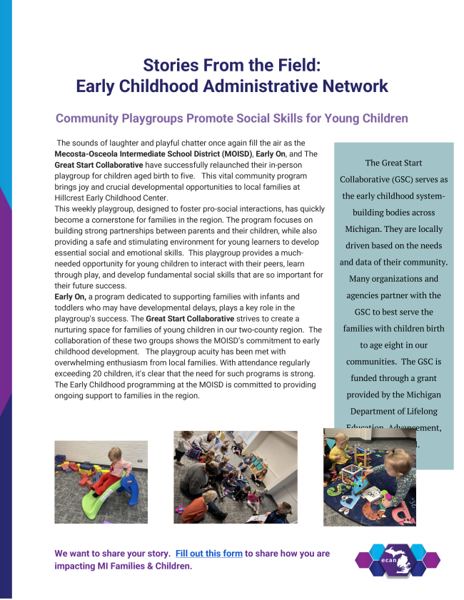 | | Community Playgroups Promote Social Skills for Children | | St. Clair County pre-k educators engage with the Plan, Study, Do, Act cycle | | Math workshop at East Lansing school engages all learners | | |