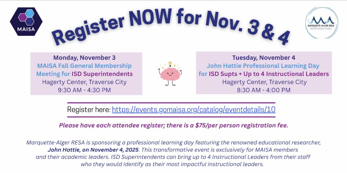 Calendar Dates and Meetings: We have provided more information on a number of meetings and opportunities for you to learn and provide input. MAISA November Conference dates, including information about a Dr. John Hattie professional learning opportunity and details about the MiSELA Conference are below. Registering early helps us better prepare for the conference. So please consider finalizing these events. MAISA/SEILN Summit: Hold the date! On Wednesday, November 19, 2025, from 8:00 a.m. to 3:00 p.m., MAISA and SEILN will host a conference about Creating Safe Learning Environments. The event will be held at two locations, Ferris State University and Marquette Alger RESA. The cost to attend is $80 per person. Breakfast, lunch, and materials will be provided. To register, head to https://events.gomaisa.org/catalog/eventdetails/52.