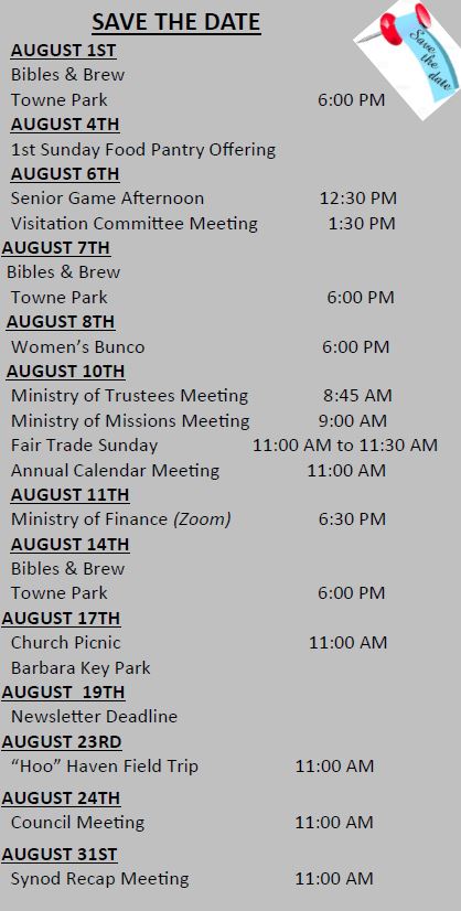 We have been home from Synod for nearly 2 weeks, and are anxious to tell everyone all about it! The bad news is, we haven’t found a Sunday in August to schedule something after a worship service until the 31st. That, of course, is good news from the viewpoint of an active church! So please plan to join us to hear more and get your questions answered.