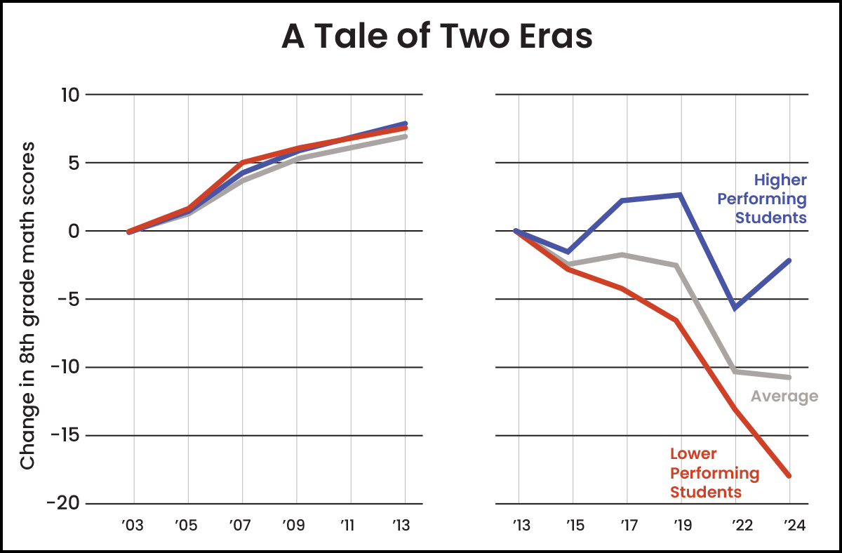 A few critics have gone further, suggesting that the Legislature should step in and require the state to adopt an independent exam to ensure consistency and comparability across years. For instance, NAEP allows us to compare results over time and shows that student achievement has flatlined and slightly decreased since 2019.