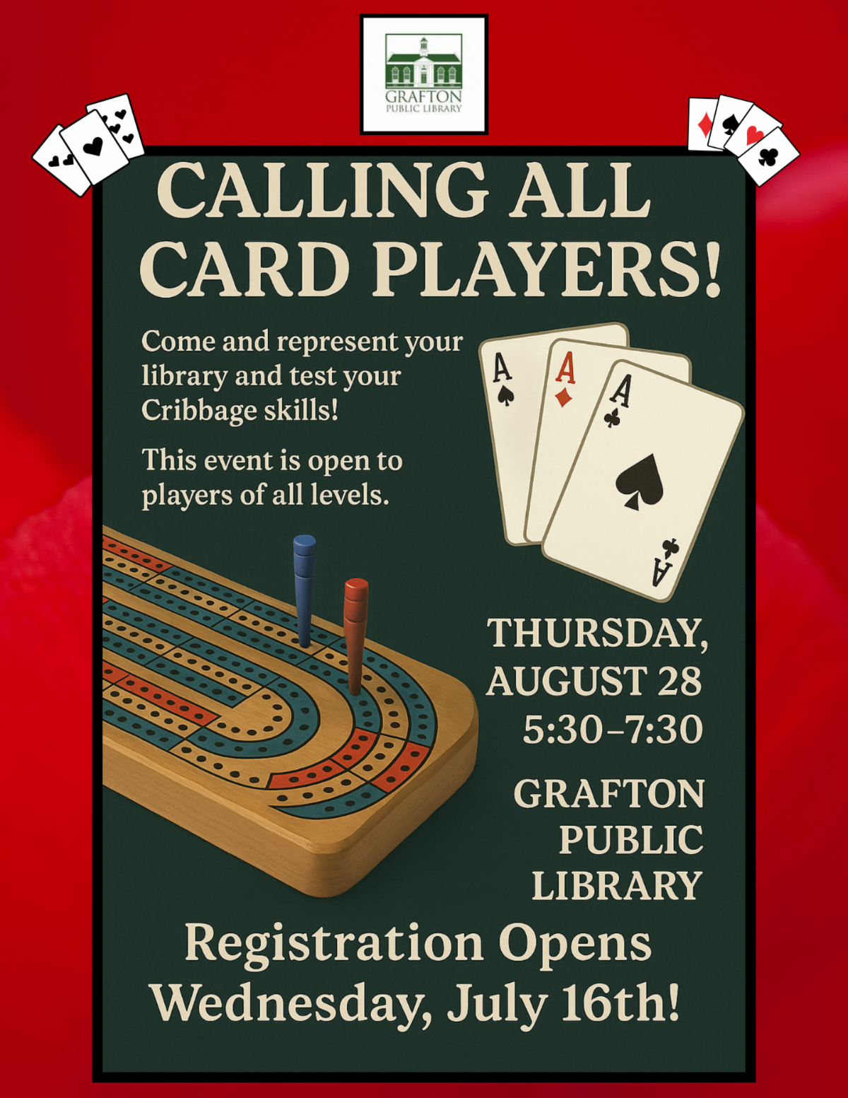 Come and represent your library and test your Cribbage skills! This event is open to players of all levels. Due to a limited number of sets, we ask that your bring your own Cribbage board and cards.