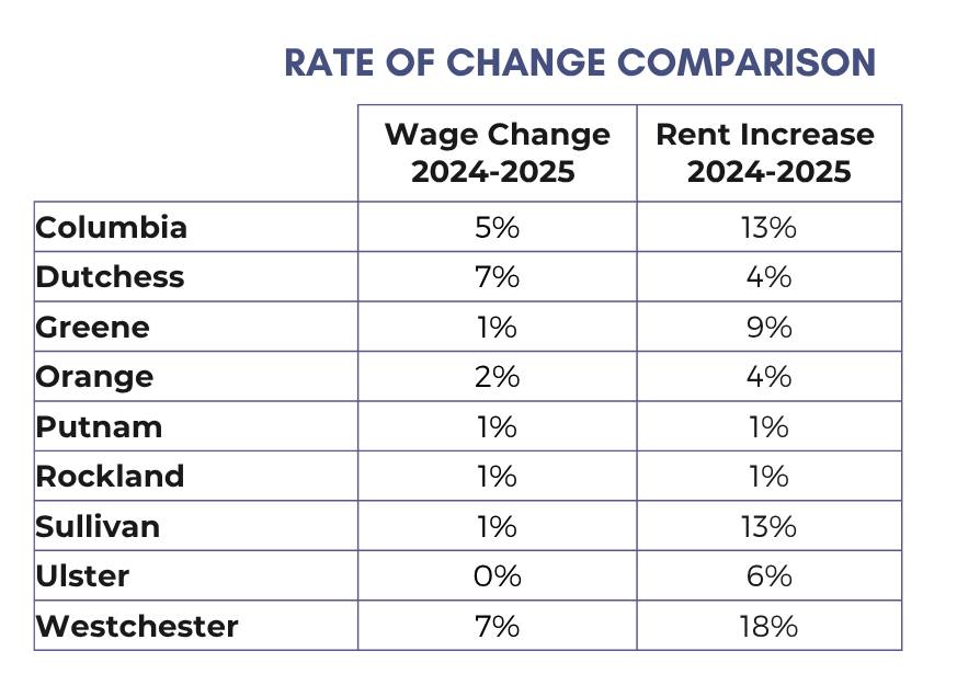 This year's data confirm what many in our region already know all too well: The cost of housing in the Hudson Valley continues to rise faster than wages for renters and buyers. Over the 5-year period from 2020 through 2025, the average rent gap grew steadily in nearly every county, with Ulster increasing by $388 (59%), Westchester by $454 (47%), and Columbia by $222 (54%). Even over the past year alone, counties like Sullivan and Westchester saw sharp year-over-year jumps of $141 (48%) and $336 (31%), respectively. For the first time this year, two working adults sharing the cost of rent in Westchester cannot afford a 2-bedroom apartment without spending more than 30% of their incomes on housing costs.