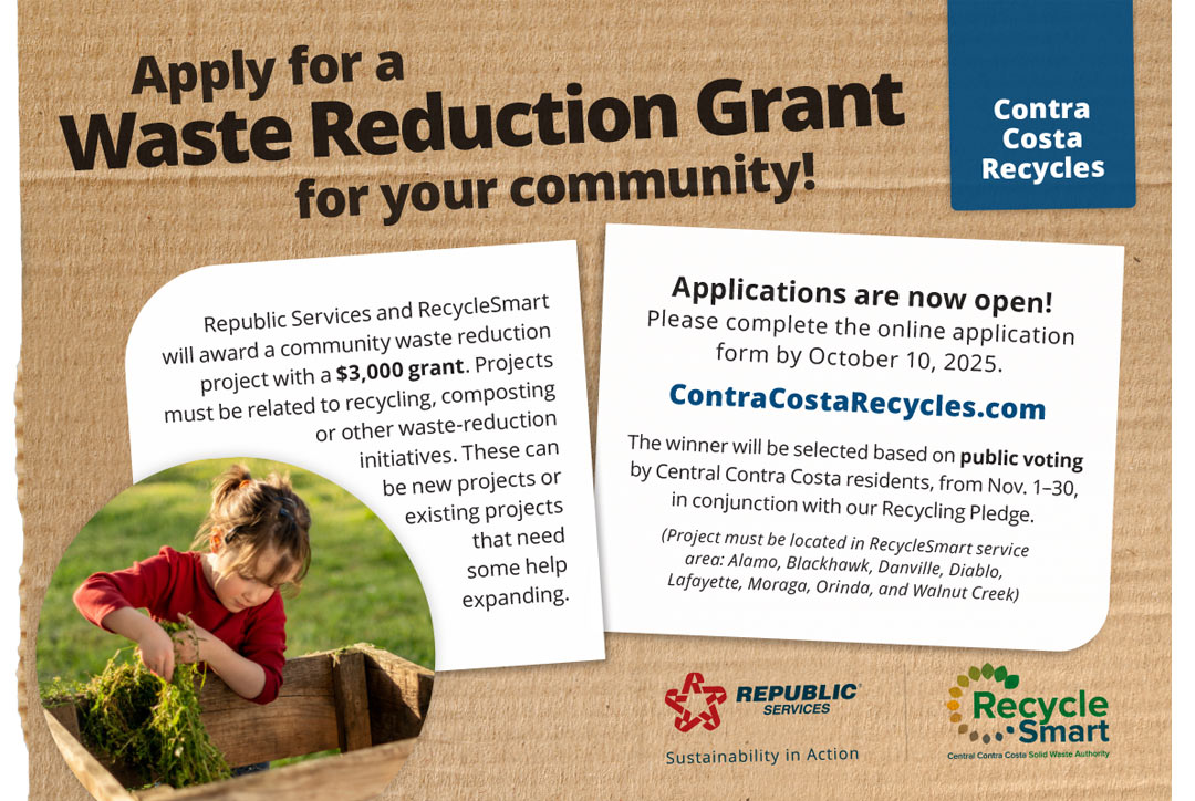 Project must be located in Republic Services’ RecycleSmart service area: Alamo, Blackhawk, Danville, Diablo, Lafayette, Moraga, Orinda, or Walnut Creek.