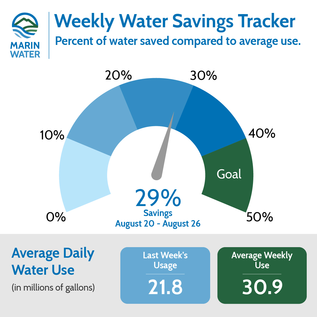 With reservoirs at historic lows, Marin Water's board of directors declared a water shortage emergency and adopted mandatory water use restrictions to help preserve our water supply. The goal of the mandatory restrictions is to achieve a 40 percent reduction in water use districtwide. We are monitoring drought conditions carefully and additional restrictions will be added as needed.
