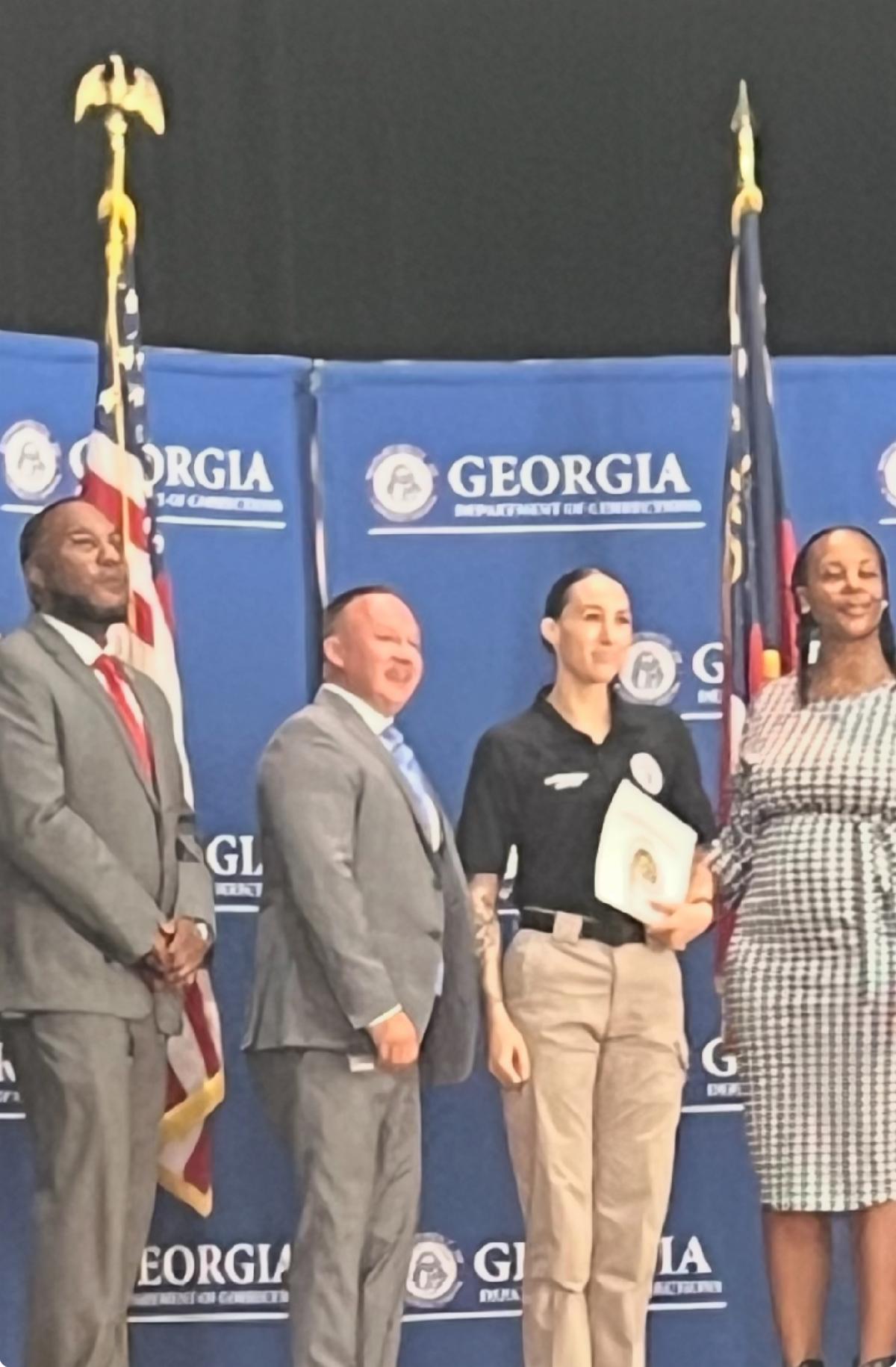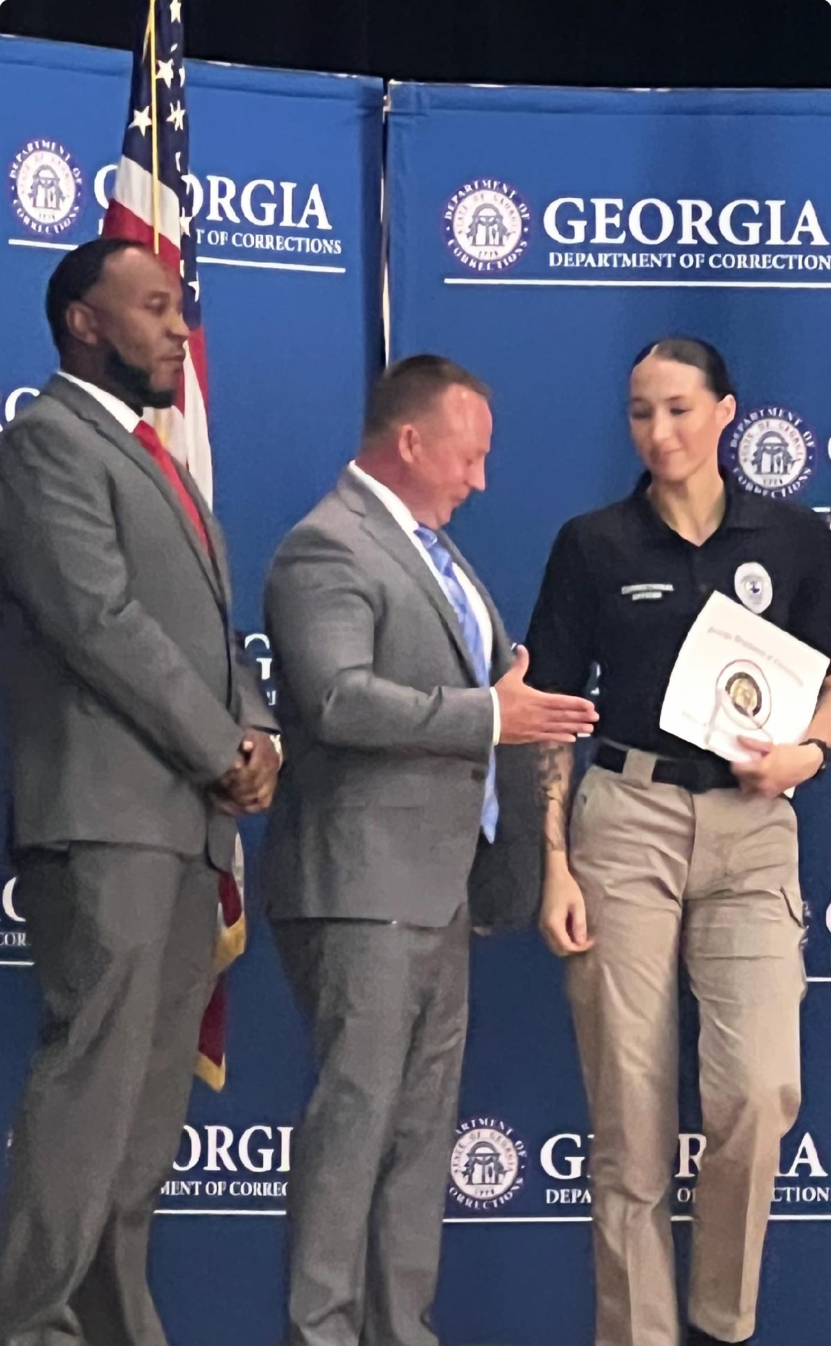 | | Warden H. Walker III recognizes, Muscogee County Prison cadet Destiny Keith who received the physical fitness award from the Georgia Department of Corrections class T-152. Cadet Keith completed the mile run in just over 8 minutes and completed the most push ups in the class earning her this recognition by the training staff overseeing the academy. | | |