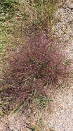 Purple lovegrass thrives in full sun in sandy soil, as the photo at left, taken on the Salt Pond trail in Eastham, demonstrates. It shrugs off the hot, dry spells of peak summer that make many other plants wilt. In moister and more fertile soils, in fact, it will be outcompeted by taller perennials.