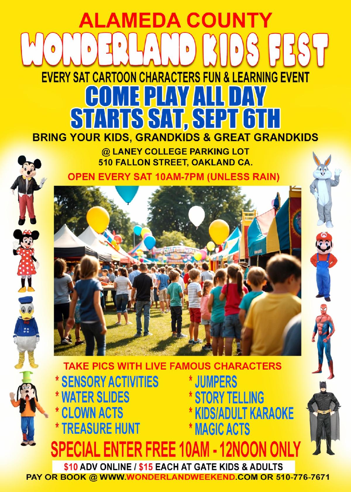 Looking for family fun? The Wonderland Kids Fest kicks off on Saturday, September 6th at the Laney College parking lot (510 Fallon Street, Oakland). Open every Saturday from 10:00 AM – 7:00 PM (weather permitting), the festival features cartoon characters, sensory activities, water slides, jumpers, storytelling, karaoke, clown acts, and more! Kids can enjoy photo opportunities with live characters and exciting entertainment all day long. Admission is free from 10:00 AM – 12:00 PM, then $10–15 after.