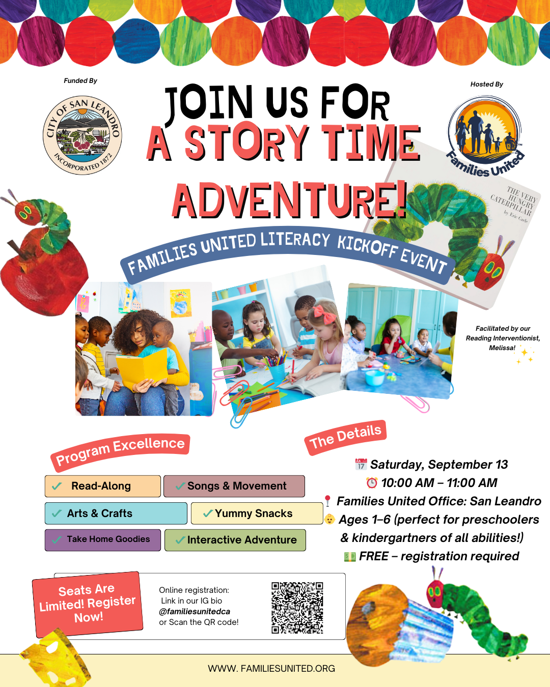 Join Families United for a Story Time Adventure on Saturday, September 13th from 10:00–11:00 AM at their San Leandro office. This free event is designed for children ages 1–6 and will feature a lively read-along, songs and movement, arts and crafts, yummy snacks, and fun take-home goodies. Registration is required, and space is limited!