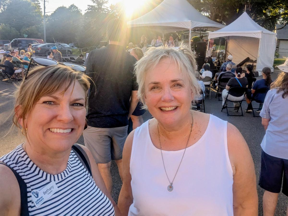 | | Pictured above: On August 20, Bethany Krepela, LPGM Development Director, visits with Kristi Shepherd, Director of Congregational Engagement at Normandale Lutheran Church, at Community Fest. The event celebrated the church's 75th anniversary with live music, food, and outdoor activities. Located in Edina, Minn., Normandale is a long-time partner of LPGM. | | | |