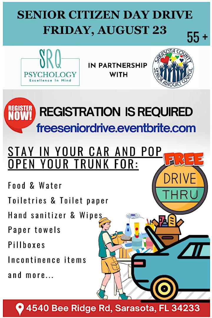 We were notified about a free resource for seniors that we wanted to share: SRQ Psychology, in partnership with Sarasota County Senior Advocacy Council, is hosting a Senior Citizen Day Drive. This drive-thru event will be held on August 23rd from 8:30am-1:30pm located at 4540 Bee Ridge Road in Sarasota. Just drive up and open your trunk to receive FREE goods like food, water, toiletries, toilet paper, paper towels, hand sanitizers and wipes, incontinence items, and more. Registration is required. Click here to register. | |