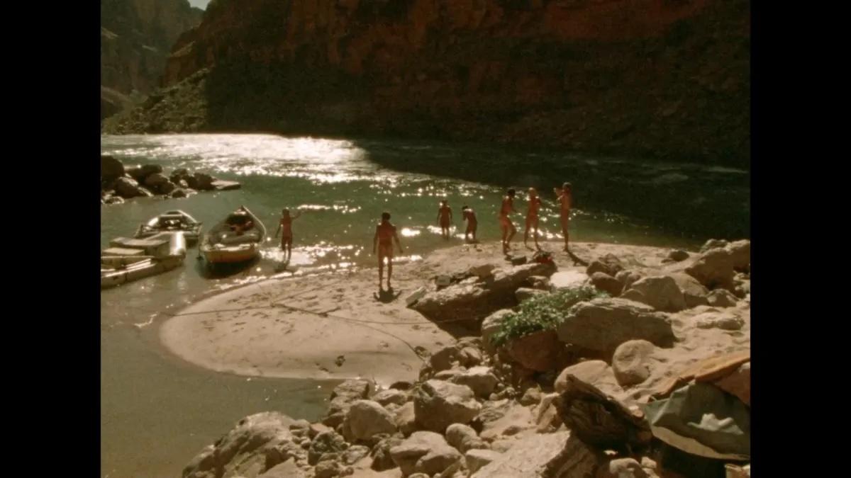 | | Image Descriptions: (left) In this still image from Robb Moss's THE BEND IN THE RIVER, several nude figures stand at a distance on sunny rocks along a river.; (right) In this still image from Ross McElwee's REMAKE, a teenage boy with light skin and dark hair, lit in a warm orange glow from below, looks with one eye through the tines of a fork. | | |