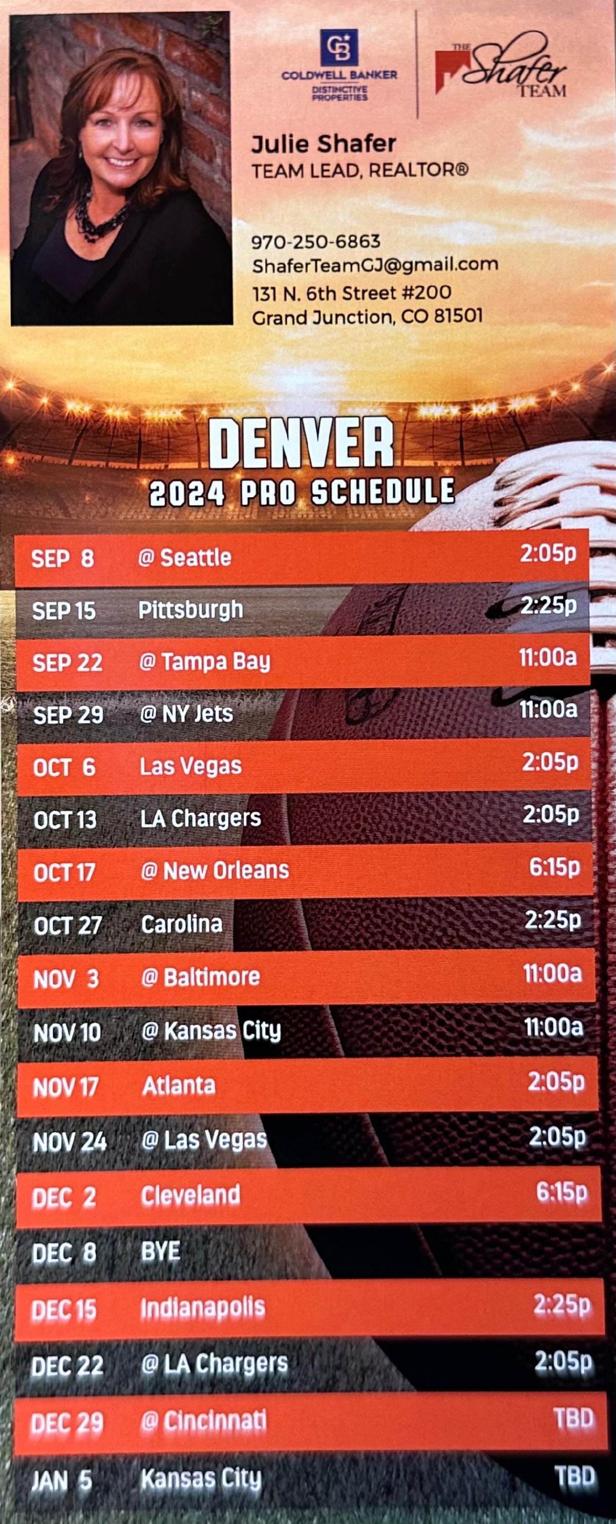 Our 2024 Broncos Schedules are in! If you would like a schedule please get in contact with Office Manager Stacy Hite, stacy.hite.16@gmail.com or (970) 210-7553 | |