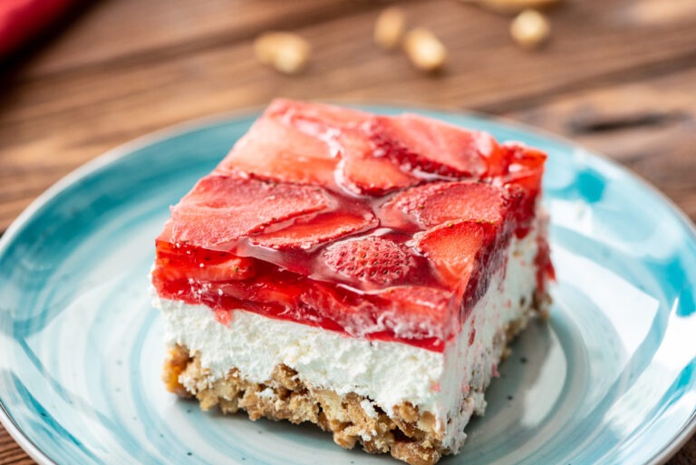 Strawberry Pretzel Salad is an old-fashioned treat everyone will enjoy! A perfect blend of salty and sweet. Featuring a buttery pretzel crust, followed by a light cream cheese layer, and mouthwatering strawberry Jell-O topping filled with more strawberries! This pretzel salad is a Southern, no-bake dessert that has been popular at potlucks, picnics, gatherings, and more!