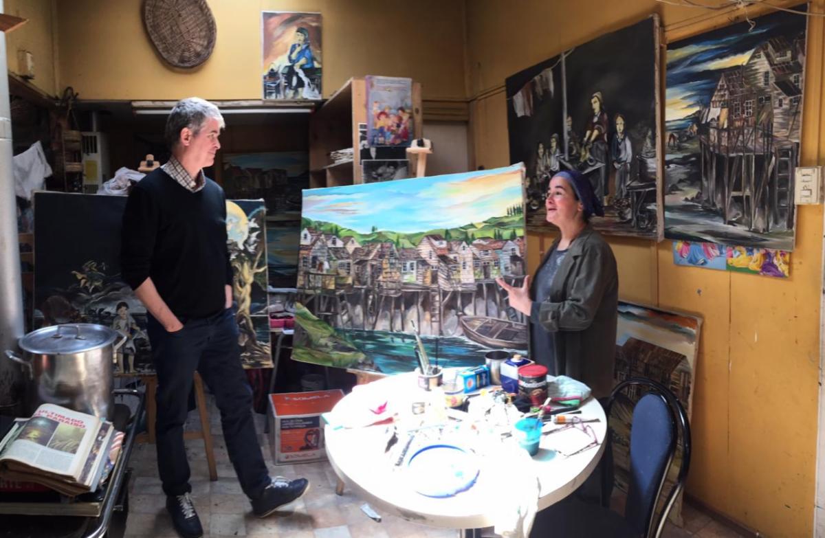 | | Marcela Contreras, Clara Yañez, Dan Cameron & Pablo Carvacho, Comarca Contuy, 2018 | | We arrived in Castro, and through different Airbnb accommodations, discovered places, people, and artists that Dan had met recently on a prior trip with the artist Gianfranco Foschino, and continued meeting on his own. We began our journey with Patricio Rojas, owner of the art gallery and café Palafito Patagonia, and soon enough, the appointments and encounters multiplied, filling a busy schedule of meetings and studio visits. We were still envisioning a large exhibition project like an art biennial, but we concluded that there wasn't much point in doing something beyond the territorial and human scale. We realized this in part because of the limited interest from local authorities and institutions, but also because we had been imagining an articulated art system that, in reality, had its own form and history. Despite recognizing that a biennial wasn't the best use of our abilities, we did recognize a very evident need among Chiloé creatives for visibility, in the form of a place to exhibit their work, and share it with people interested in art and culture. We had long and unforgettable conversations with Silvia Rivera, Andrés Ávila, Raquel Aguilar, Anelys Wolf, José Triviño, Guillermo Gres, and Rafael Lara. I dare say those conversation aren't over yet, which is why each time we meet again, the dialogue resumes with the same intensity as it left off, only now it resonates beyond the Archipelago, in Puerto Varas (CAAM and Bosque Nativo) and in Santiago (Patricia Ready and Montecarmelo), as, little by little, a growing interest in recognizing new creativity from southern Chile has spread. | | Dan Cameron in Silvia Rivera's studio, Castro, Chiloé, 2018 | | Given the premise that as curators, we not only make exhibitions, but generate mental and physical spaces to exchange sensations and world views and, above all, listen to makers who have so much to share, we felt at that moment that we’d discovered a new role in the midst of this culture. We could begin to mediate and connect the worlds between different thresholds as we advanced through the portal of imagination that is Chiloé — “portal” being a frequently heard word in the Archipelago, indicating an instance where the real and the supernatural naturally coexist. | | |