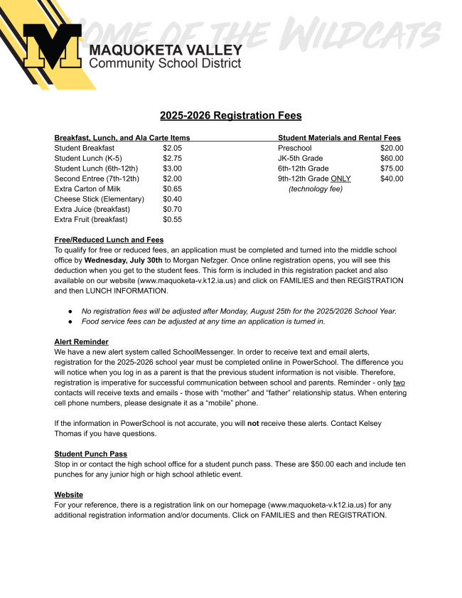 If you have any questions pertaining to the Free and Reduced Meals, you can contact Morgan Nefzger at morgannefzger@maquoketa-v.k12.ia.us