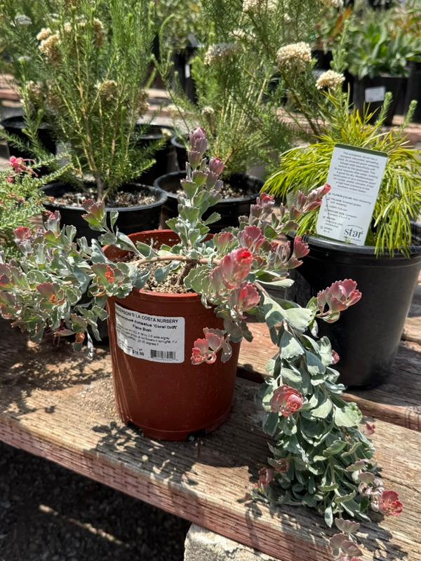 Here's my list of noteworthy plants for this month: San Marcos Growers exclusives- once they're gone, that's it. Adenanthos 'Coral Drift' (a great foliage plant with silver leaves and coral-colored new growth), Grevillea 'Magic Lanterns' (silver-gray leaves with cherry-red flowers that hang down from the branches), and Thomasia solanacea 'Velvet Star' (a great shrub for shaded or filtered light that can tolerate dry soil).