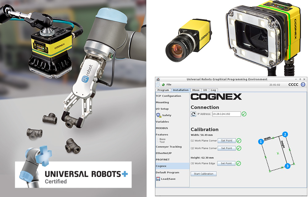 Cognex has developed a URCap solution with Universal Robots to greatly simplify the communication, hand eye calibration, and vision guided robotics development between a UR robot and Cognex 2D Vision System. The system is used to guide the robot to specific coordinates, inspect the part after manipulation, and output valuable data for downstream analysis.