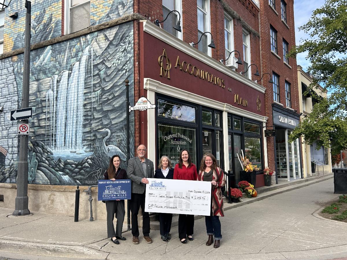 HALTON HILLS, ON – The Town of Halton Hills is proud to announce the successful completion of a façade improvement project in downtown Georgetown, supported through the Community Improvement Plan (CIP). On October 15, Councilors Norris, and Garneau, together with the Town’s Economic Development staff, presented Accountants on Main with a grant cheque for $12,045.74 to support the revitalization of their property.