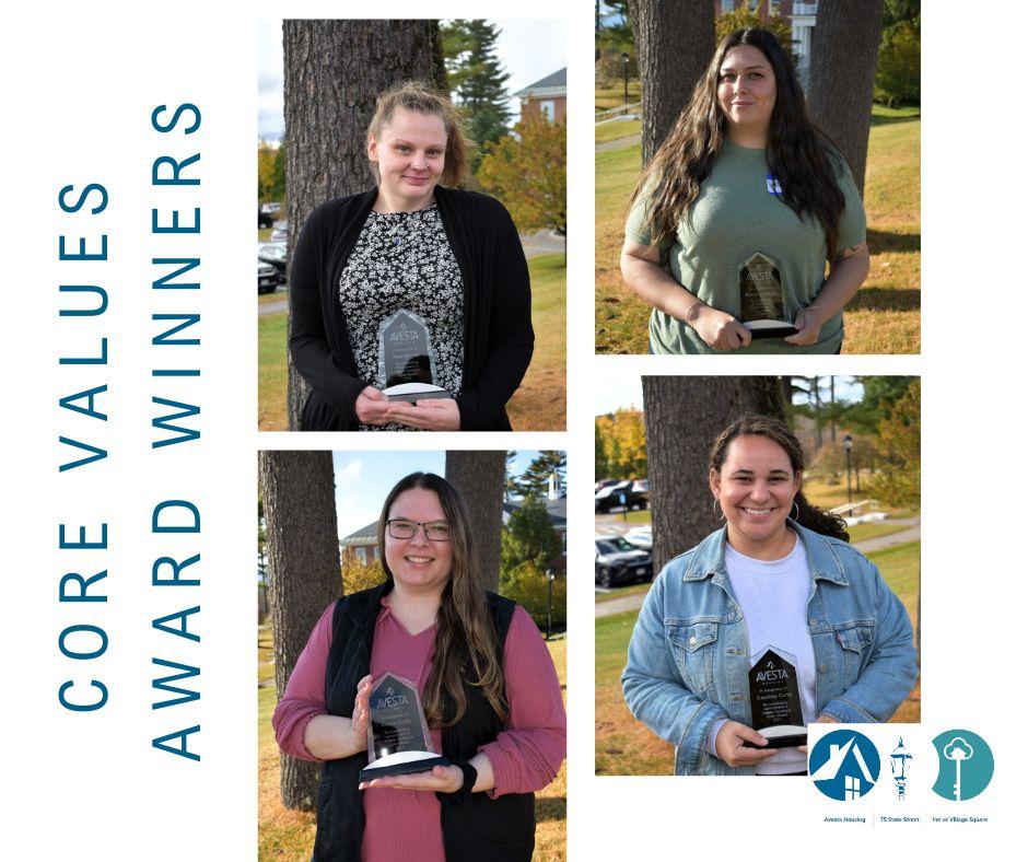 | | Avesta announces Core Values & Property of the Year honorees | | Avesta Housing Core Values award winners (clockwise from top left): Senior Accounting Specialist Alicia Burnett, Senior Property Manager Montana Galvan, Lead Waitstaff Courtney Curtis, and Health Services Supervisor Allison Curtis | | On Oct. 22, Avesta Housing held its annual All Staff Day at Pineland Farms in New Gloucester, Maine. The event brought together employees from all departments to recharge, socialize with co-workers, and engage in strategic activities designed to identify ways we can strengthen our organization. | | | |
