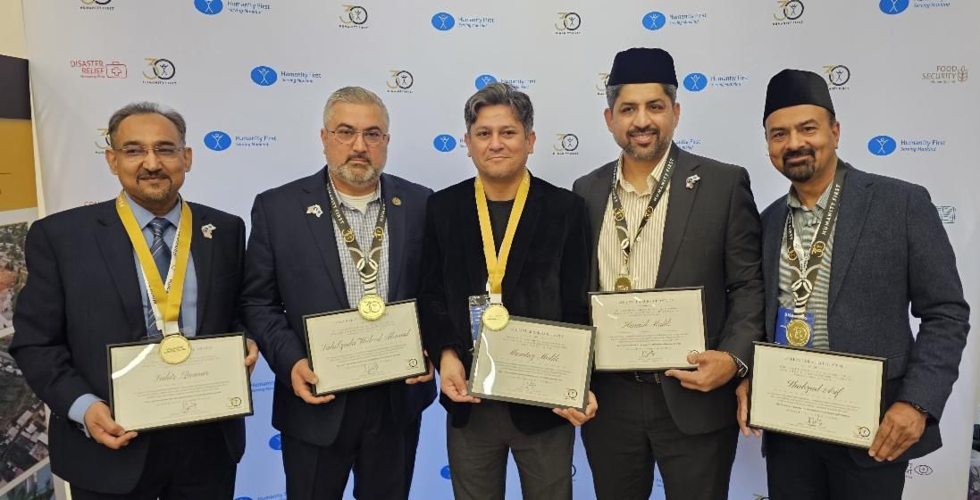 Munum Naeem (USA Chairman & Executive Director), Bashir Malik (USA VP Corporate Governance & HR), Nudrat Salik (USA VP Finance), and Dr. Mahmood Qureshi (HFI and USA VP Disaster Relief), Kandali Lubis (Indonesia HF Chairman), and Dr. Abdul Haleem Arain (Liberia HF Chairman) were each recognized for over 20 years of leadership in their countries.