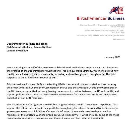 BAB submitted a response to the UK Department for Business and Trade’s consultation that will help shape the UK’s future Trade Strategy. BAB’s submission identifies the following points in response to the three main consultation questions: