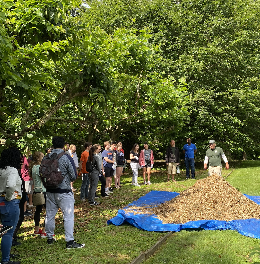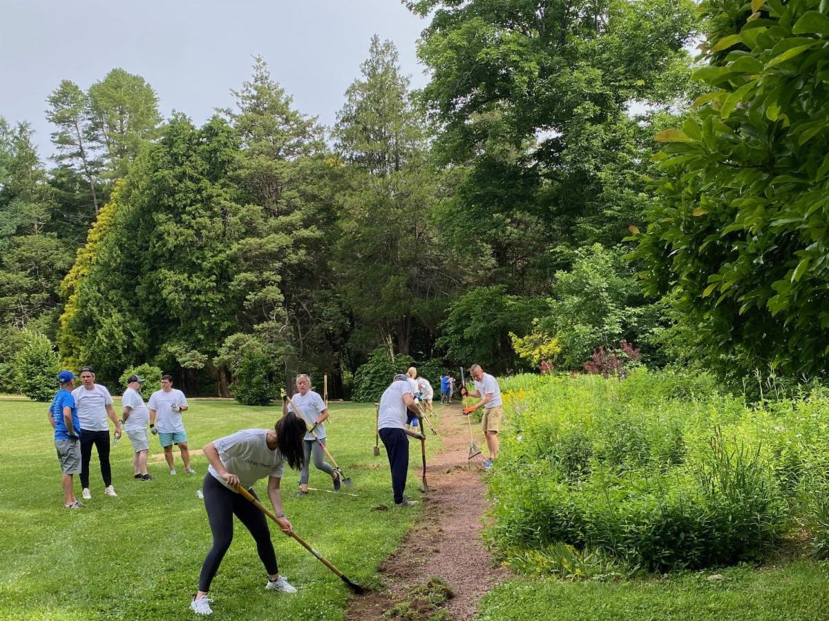 Just this week we welcomed 40+ volunteers from Pitney Bowes (top left) and 60 college juniors spending the summer interning with Synchrony (bottom left--getting instruction from Lenny before they dig into one of several mulching projects).