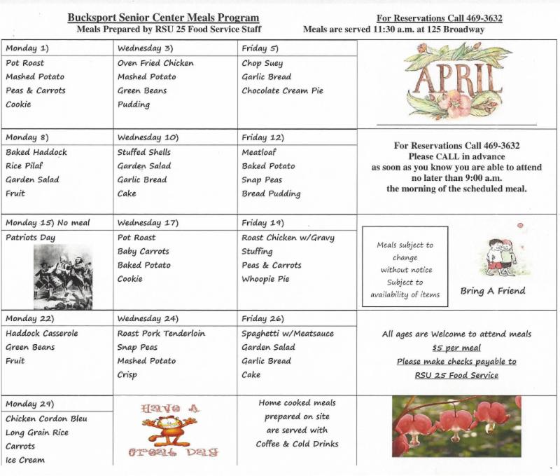 Our meals here at the Center are prepared fresh daily. Our kitchen is supervised by local restaurateur Glenn Redman. The meals are available to local Seniors in Bucksport and the surrounding towns.