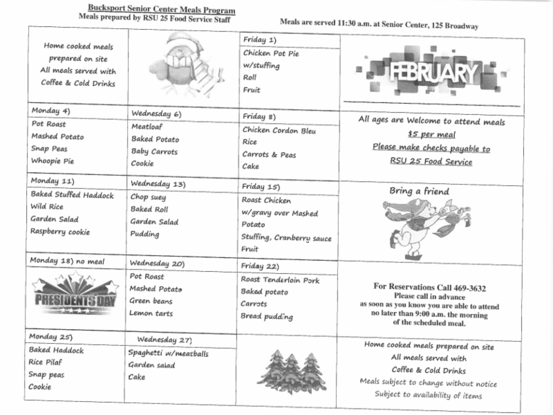 Our meals here at the Center are prepared fresh daily. Our kitchen is supervised by local restaurateur Glenn Redman. The meals are available to local Seniors in Bucksport and the surrounding towns.