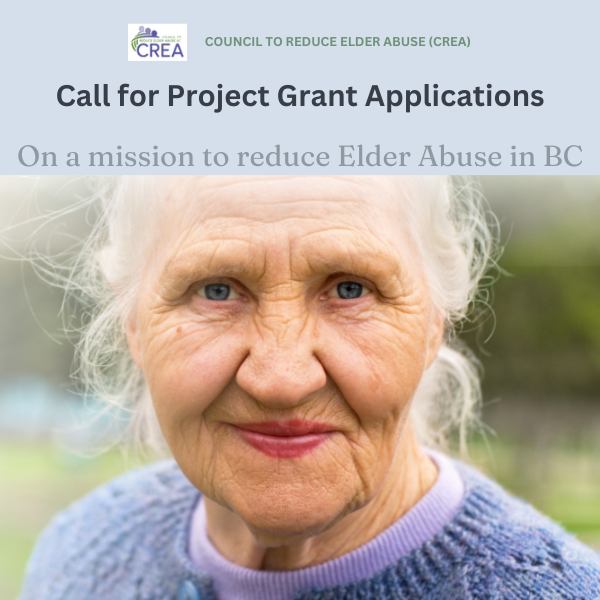 The British Columbia Council to Reduce Elder Abuse (CREA) is now calling for Capacity Building grant submissions for the 2025-2026 term, and invites all current and prospective grantees to apply. Deadline for submissions is February 20, 2025. All projects must provide increased knowledge/information to advance the Mission of the Council to Reduce Elder Abuse, which is to raise awareness about elder abuse and neglect prevention, recognition, and response amongst stakeholders in British Columbia.