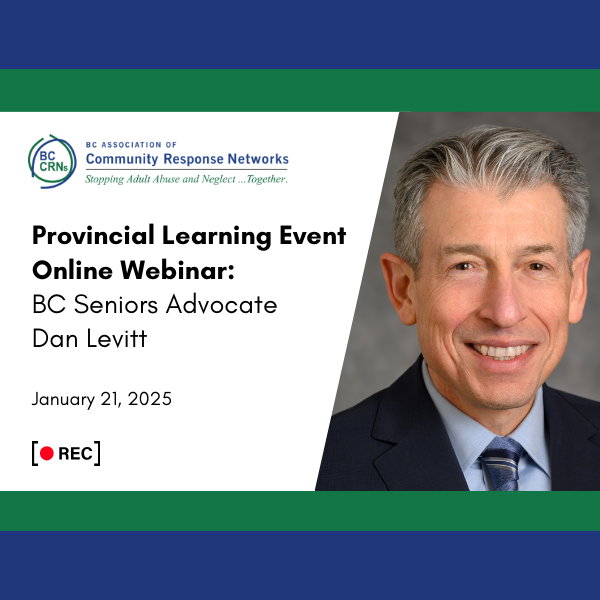 Dan Levitt, BC Seniors Advocate, was the guest presenter for BC CRN’s January Provincial Learning Event webinar. A knowledgeable and longtime expert on the topics of aging and supporting seniors, Levitt presented with humour and humility. He spoke about ageism and its link to abuse, neglect and self-neglect, as well as other pressing issues affecting seniors’ quality of life.