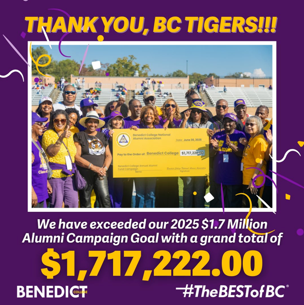 | | On Saturday morning, Tiger Nation gathered along Sumter Street for the beloved Homecoming Parade. Led by The Honorable Derrek L. Pugh, Vice Chairman of the Richland County Council and this year’s Grand Marshal, the parade featured colorful floats, student organizations, community groups, and, of course, the incomparable Marching Band of Distinction. | | After the parade, fans headed to Charlie W. Johnson Stadium for one of the biggest games of the season. Tailgating kicked off at 12 p.m., filling the campus with the aroma of great food, laughter, and reconnecting with old friends. At 2 p.m., the Tigers took the field against the Virginia University of Lynchburg Dragons, determined to bring home a Homecoming victory in front of thousands of roaring supporters. | | The Benedict Tigers brought home the win, and our amazing alumni made it even sweeter by celebrating over $1.7 million in gifts for the 2024–2025 annual giving campaign! | | A Grand Finale: Forty Under 40 Celebration Brunch | | |