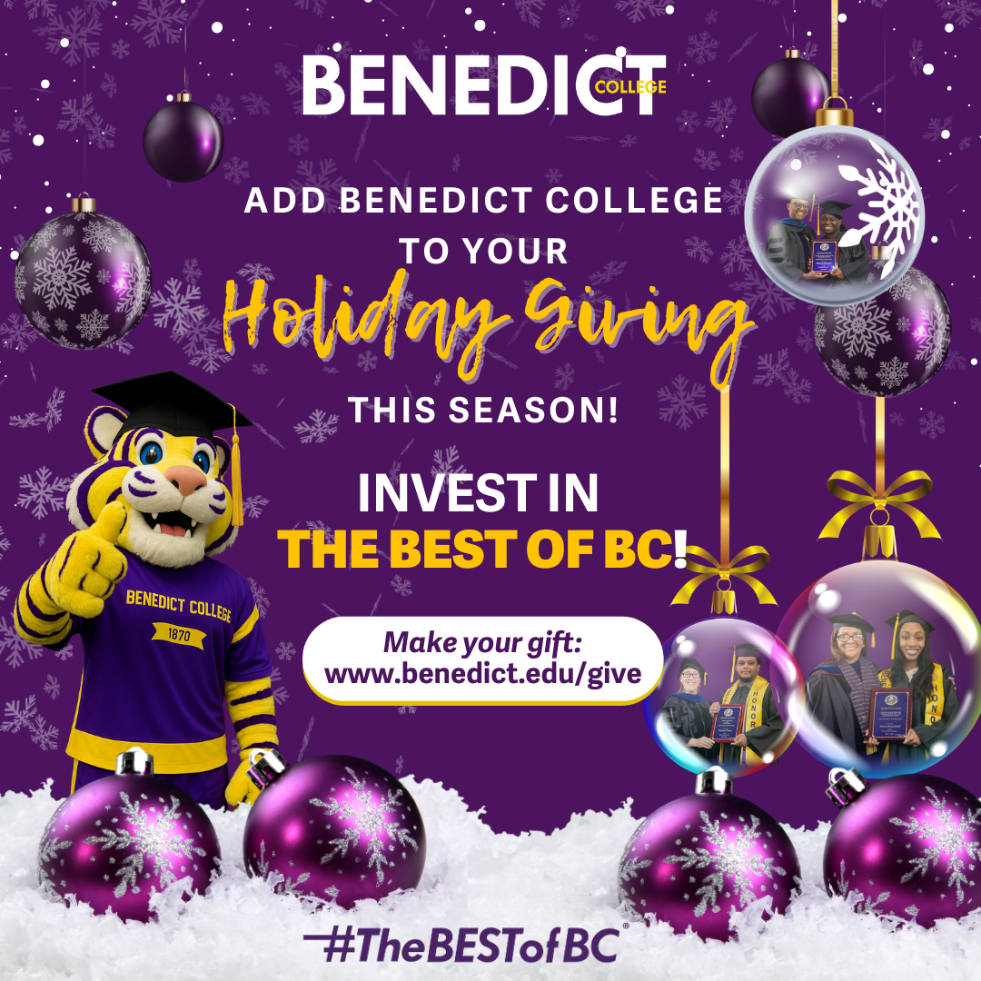 | | (Left to right) Midshipman Semira Daniels, Charlotte, NC; Midshipman Amya Hout, North Augusta, GA; Midshipman Myakai Robinson, Columbia, SC; Midshipman Anissa Barraza, North Augusta, GA and Midshipman Kennedi Mitchell, Columbia, SC. | | Over a Decade of Generosity: Benedict Alumni Give Over $16 Million to Benedict College | | Benedict College Celebrates Over a Decade of Philanthropic Excellence | | On July 16th, the Benedict College Tigers proudly commemorates a significant philanthropic milestone as alumni and supporters around the world celebrate over a decade of exceeding annual fundraising goals. For the eleventh consecutive year, the Benedict College Tigers have surpassed expectations - this time by a notable margin. The 2025 Annual Fund goal of $1.7 million was exceeded by $17,222.00, resulting in a total of $1,717,222.00 raised in support of the College’s mission and students. All contributions reported in the Annual Giving Campaign are funds that have been received and not future pledges or commitments. | | New accreditation and specializations for Benedict College’s MBA program | | The Benedict College Master in Business Administration degree has received the highly coveted accreditation from the Accreditation Council for Business Schools and Programs (ACBSP). ACBSP is a global business education accrediting body and the only organization to offer accreditation to all levels of collegiate business educational degree programs from associate to doctoral. | | Antisdel Chapel Undergoes Historic Renovation | | Benedict College’s historic Antisdel Chapel, a neoclassical brick building constructed in 1932 during the Great Depression, is receiving a major renovation. Originally built by College’s first Black president, Dr. John J. Starks, the chapel has long served as a spiritual and cultural cornerstone of the campus. | | The BEST of BC Faculty and Staff | | Benedict College proudly salutes President Roslyn Clark Artis, who has been named one of Essence magazine’s Power Players for 2025 | |