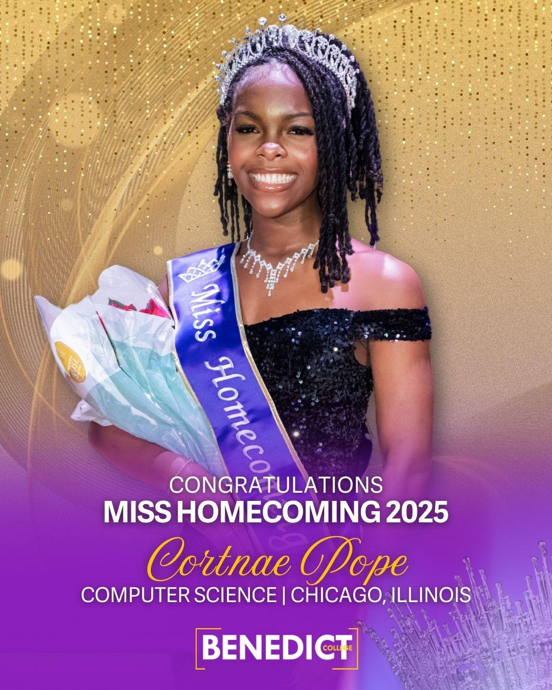 | | Two days later, on Sunday, October 26, the stage shined once again as the College hosted the Benedict College Homecoming Pageant 2025. Representing the Windy City— Chicago, Illinois, Cortnae Pope captured the crown as Miss Homecoming 2025, earning applause and admiration from the entire Tiger family. | | The momentum continued on Monday, October 27, as the runway lit up with style, confidence, and creativity during the highly anticipated BC Fashion Show. Students showcased everything from bold streetwear to nostalgic 90’s-inspired looks, proving that Tiger fashion is as fierce as Tiger Pride itself. | | On Tuesday, October 28, Benedict College celebrated its global diversity with International Village Day in the Swinton Campus Center Café. Students and guests enjoyed vibrant music, art, dance, and cultural displays that highlighted the rich international fabric of the BC community. | | |